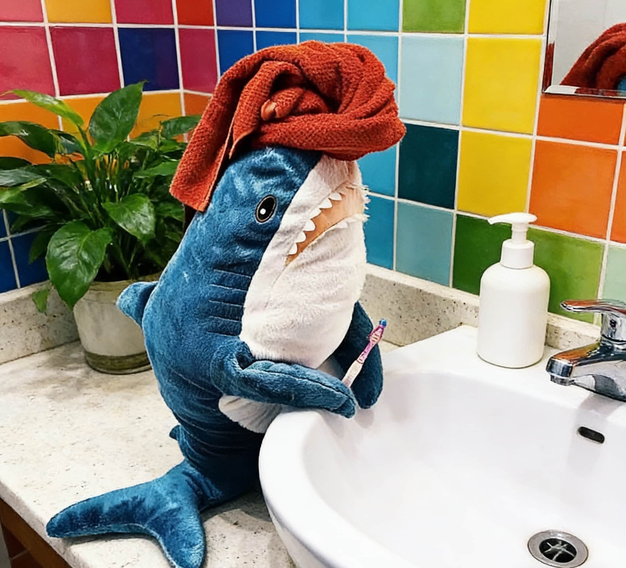 When Your Shark Plush Embraces Self-Care: The Viral Bathroom Brushing Moment